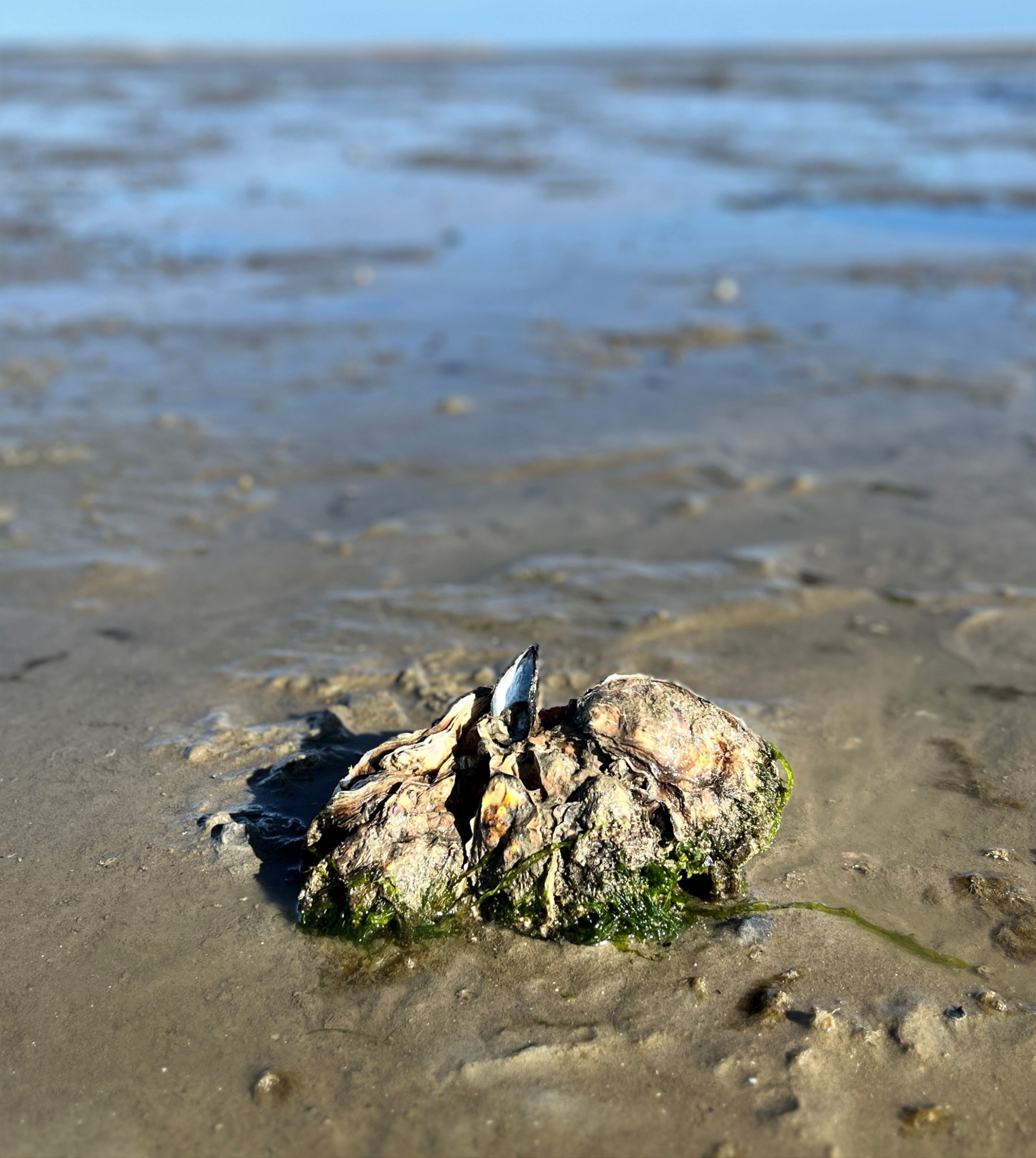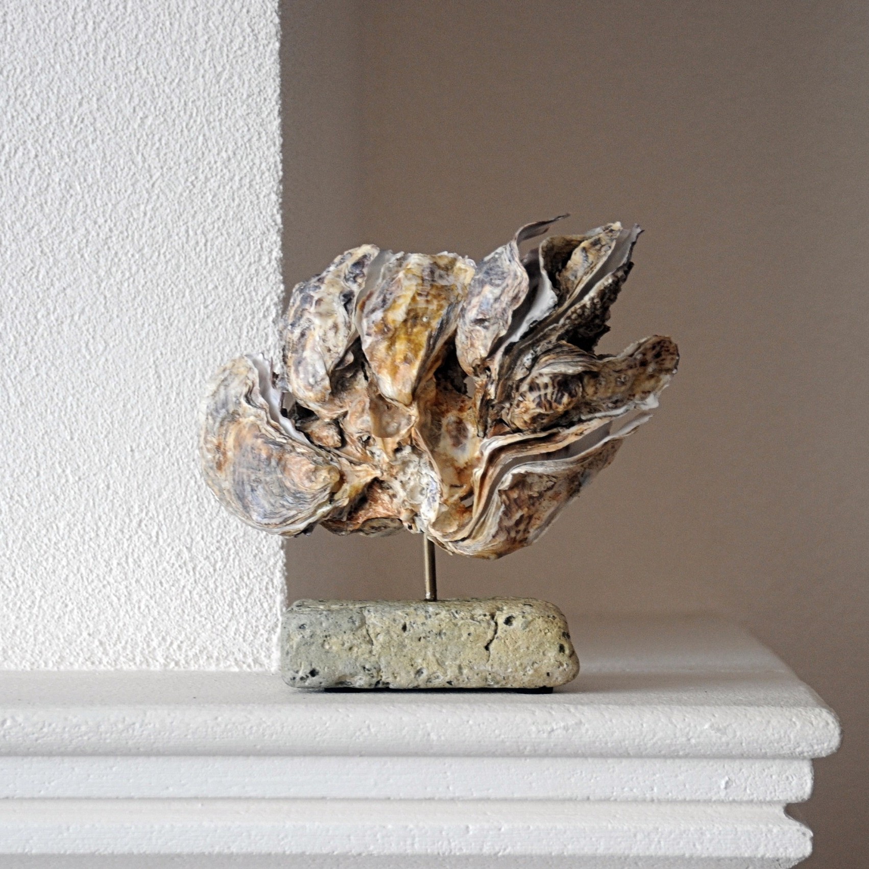 Negen gelijkgrotige oesters die gretig alle kanten op wijzen: dat ademt Jutterskoorts uit. De mosseltjes die zich in deze robuuste waaier verschuilden lieten los en verloren helaas hun schuilplek toen ik deze klont meenam. Zijn voetstuk is een door de heen en weer gaande IJsselmeergolven afgesleten (bak)steen.