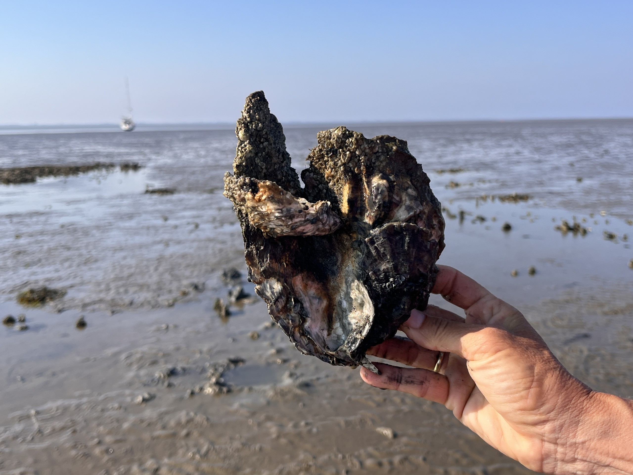 Dit dappere Skûmkopke rees fier omhoog uit het borrelende, slurpende, klotsende Wad, in de baai bij De Cocksdorp aan de oostkant van Texel. De sokkel is een in weer en wind afgesleten baksteentje, gevonden op een IJsselmeerstrandje.